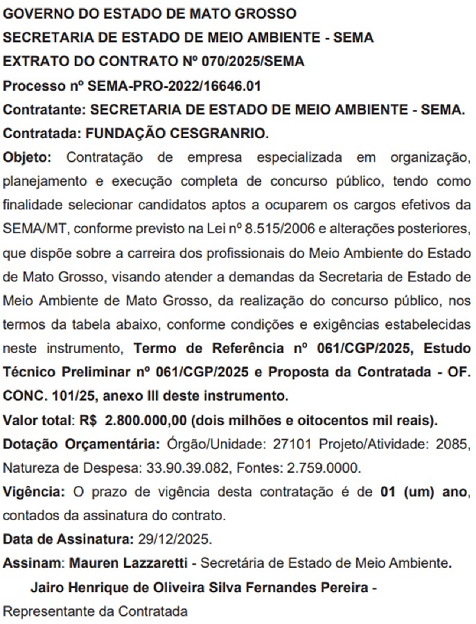 O Governo do Estado, por meio da Secretaria Estadual de Meio Ambiente, oficializou a contratação da Fundação Cesgranrio como banca organizadora do concurso público da pasta. O extrato do contrato foi publicado no último dia 29 de dezembro e prevê que o certame terá um custo de R$ 2,8 milhões para os cofres públicos.